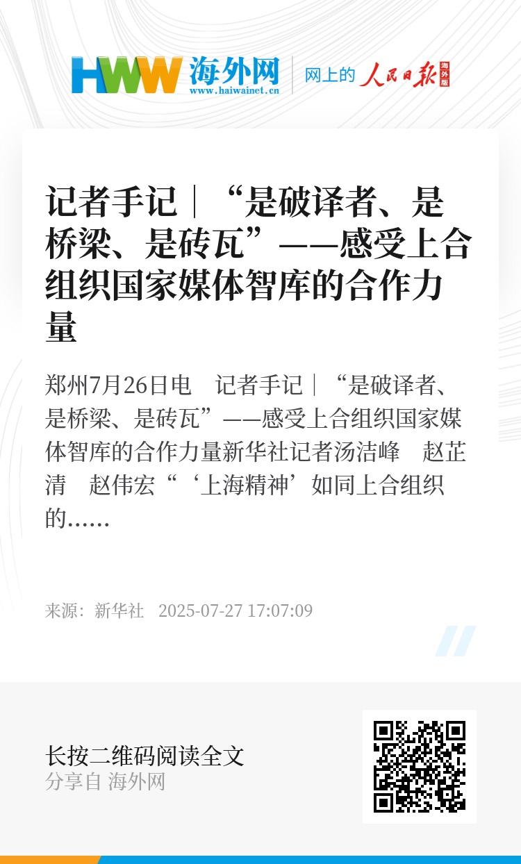 新华社郑州7月26日电 记者手记|“是破译者、是桥梁、是砖瓦”——感受上合组织国家媒体智库的合作力量