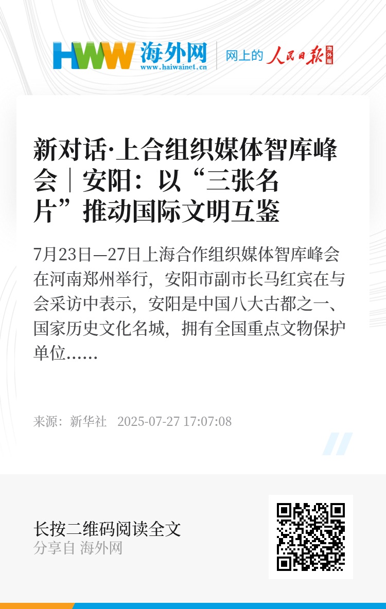 7月23日—27日上海合作组织媒体智库峰会在河南郑州举行,安阳市副市长马红宾在与会采访中表示,安阳是中国八大古都之一、国家历史文化名城,拥有全国重点文物保护单位26处,其中最核心的是由甲骨文、殷墟、红旗渠组成的“三张名片”,这些都是国际文明互鉴的重要载体。面向未来,还将通过文字起源比较研究、文字活化利用等形式,促进各成员国对中华文明的理解,为构建新型国际关系,为推动国际文明互鉴注入文化力量。