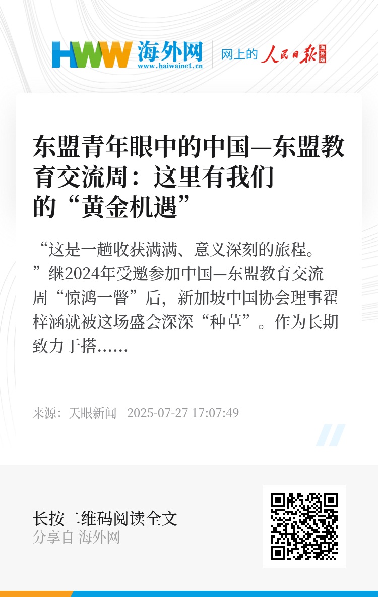 “这是一趟收获满满、意义深刻的旅程。”继2024年受邀参加中国—东盟教育交流周“惊鸿一瞥”后,新加坡中国协会理事翟梓涵就被这场盛会深深“种草”。