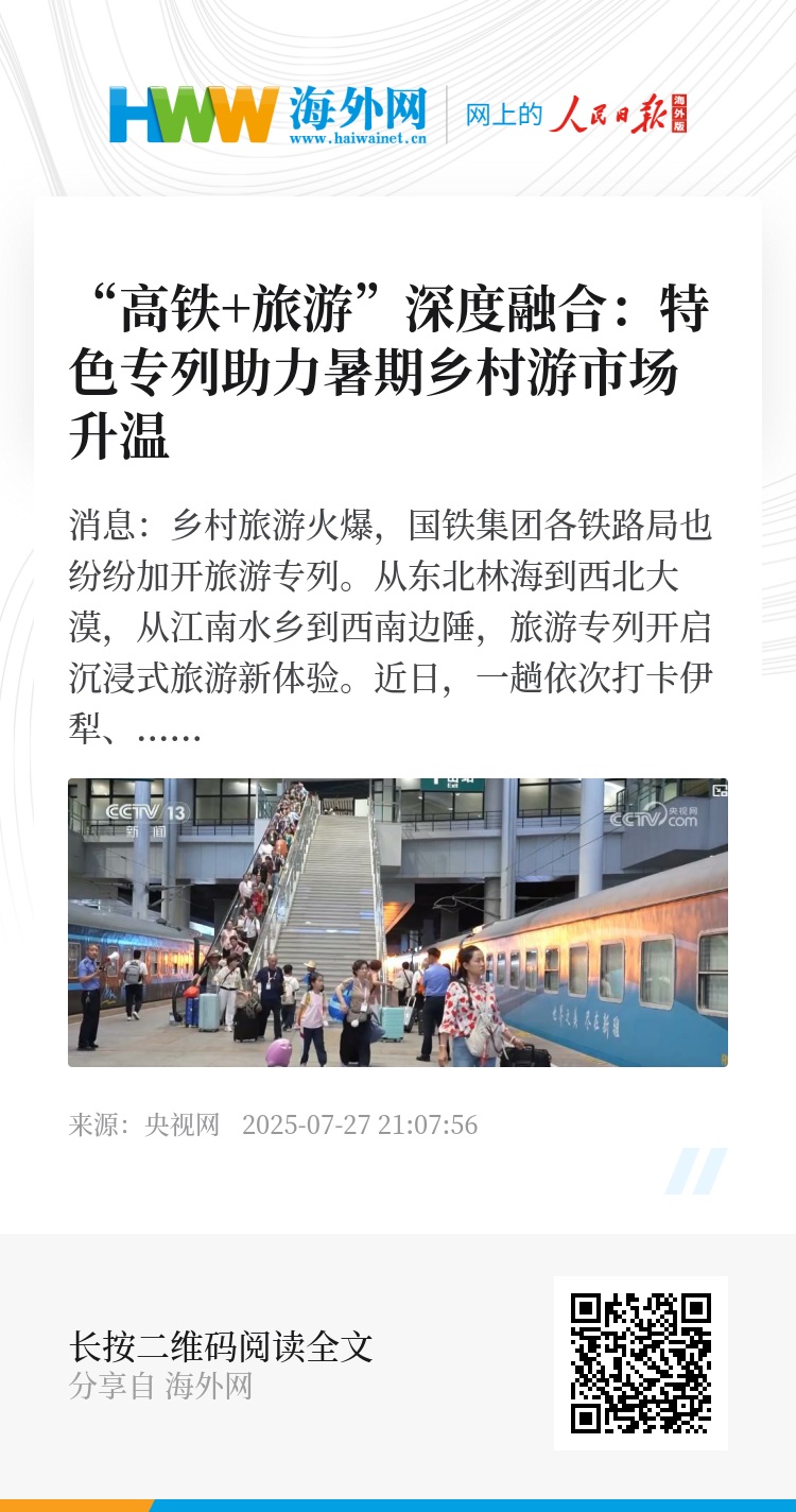 央视网消息:乡村旅游火爆,国铁集团各铁路局也纷纷加开旅游专列。从东北林海到西北大漠,从江南水乡到西南边陲,旅游专列开启沉浸式旅游新体验。