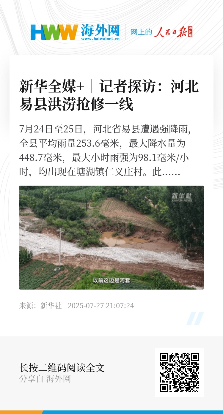 7月24日至25日,河北省易县遭遇强降雨,全县平均雨量253.6毫米,最大降水量为448.7毫米,最大小时雨强为98.1毫米/小时,均出现在塘湖镇仁义庄村。