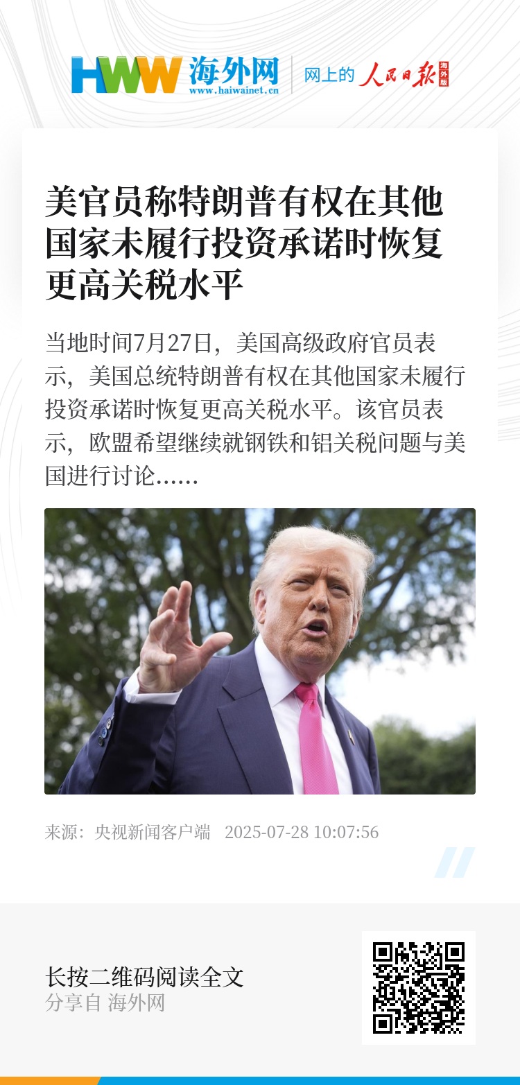 当地时间7月27日,美国高级政府官员表示,美国总统特朗普有权在其他国家未履行投资承诺时恢复更高关税水平。