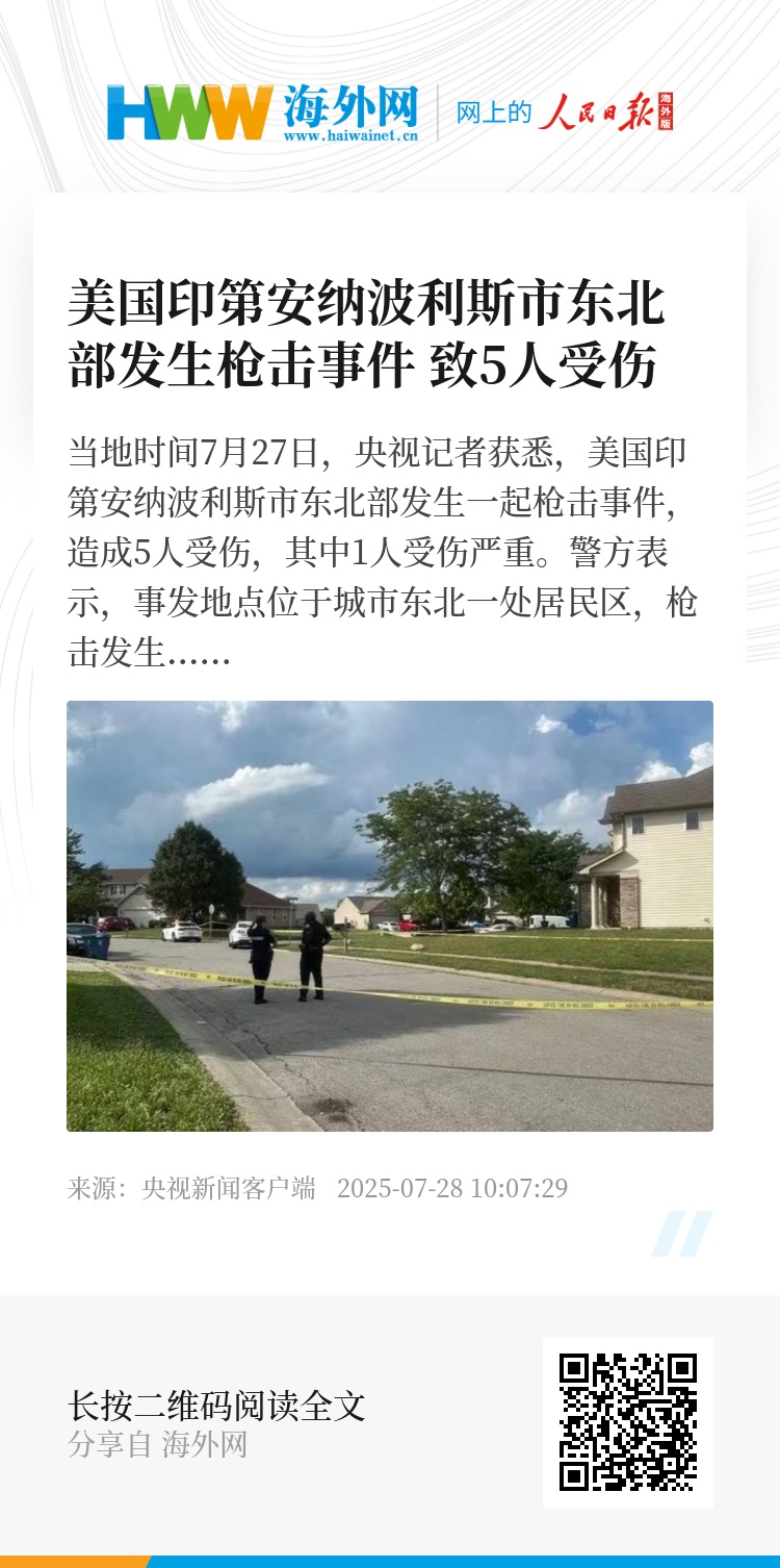 当地时间7月27日,央视记者获悉,美国印第安纳波利斯市东北部发生一起枪击事件,造成5人受伤,其中1人受伤严重。