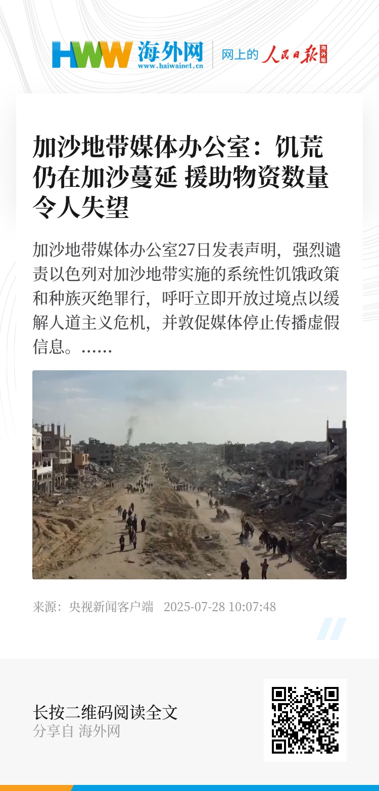 加沙地带媒体办公室27日发表声明,强烈谴责以色列对加沙地带实施的系统性饥饿政策和种族灭绝罪行,呼吁立即开放过境点以缓解人道主义危机,并敦促媒体停止传播虚假信息。
