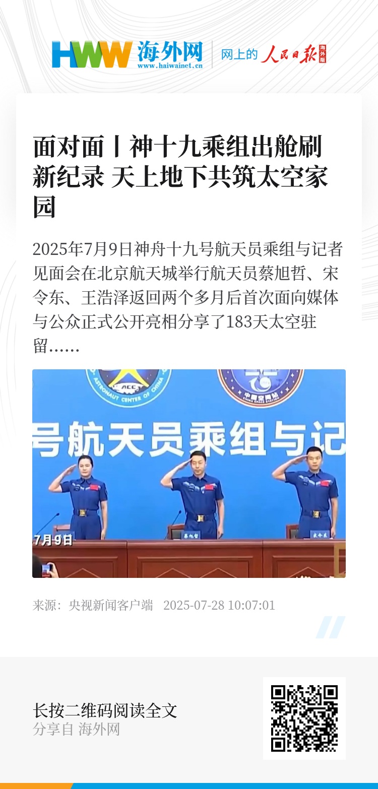 王浩泽:地面上是自己的家,天上也是我们的家。自从经历了这次飞行,我更觉得空间站这么复杂的系统,这么多的实验,飞行有这么多人的保障。天上的空间站不仅仅是航天员的家,它是千千万万航天科技工作者,共同的家。