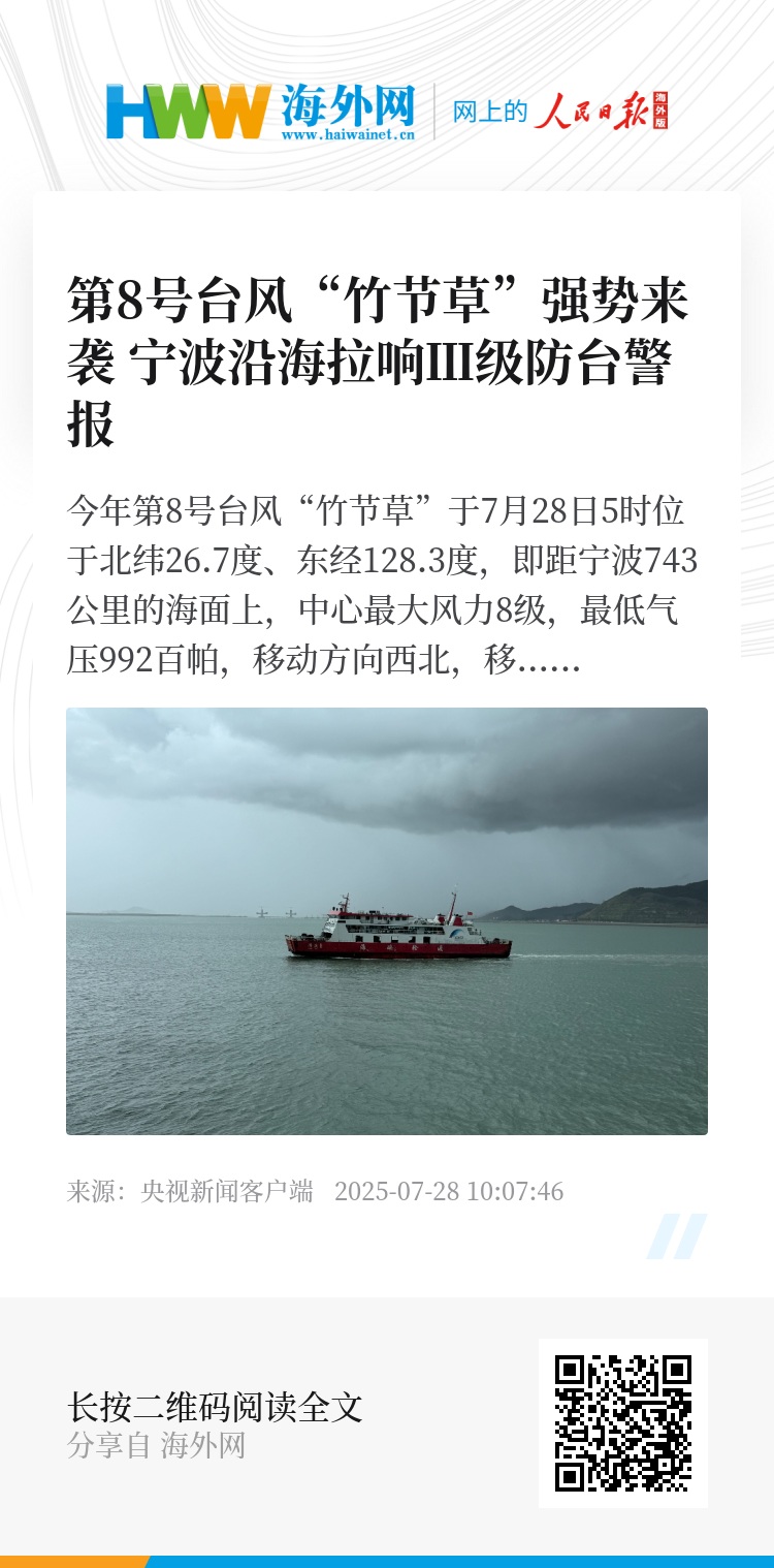 今年第8号台风“竹节草”于7月28日5时位于北纬26.7度、东经128.3度,即距宁波743公里的海面上,中心最大风力8级,最低气压992百帕,移动方向西北,移动速度每小时20公里。根据台风动态和发展趋势,宁波沿海从7月28日7时起进入Ⅲ级防台应急响应。截至今天上午8时,宁波沿海63项沿海涉水工程已全部停工。