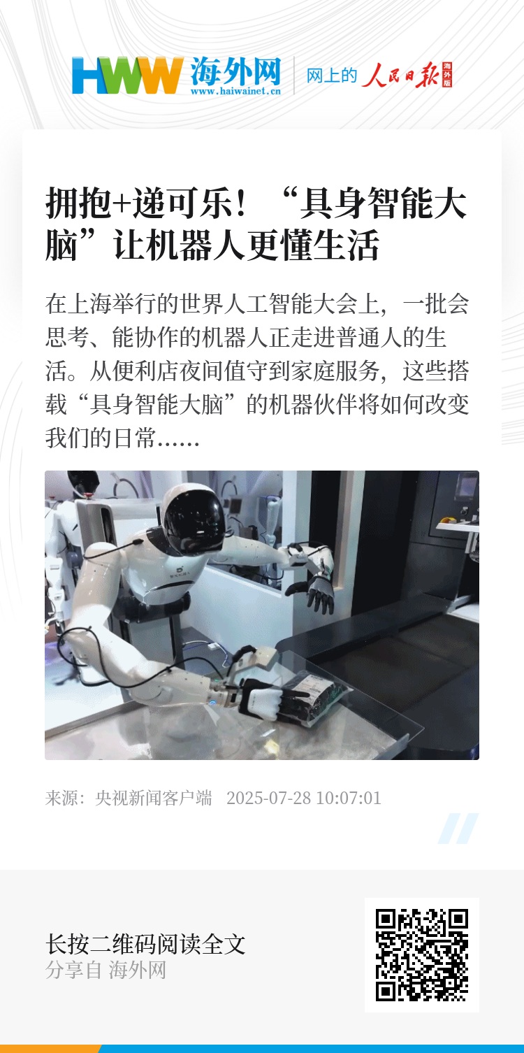 在上海举行的世界人工智能大会上,一批会思考、能协作的机器人正走进普通人的生活。从便利店夜间值守到家庭服务,这些搭载“具身智能大脑”的机器伙伴将如何改变我们的日常?来看报道。