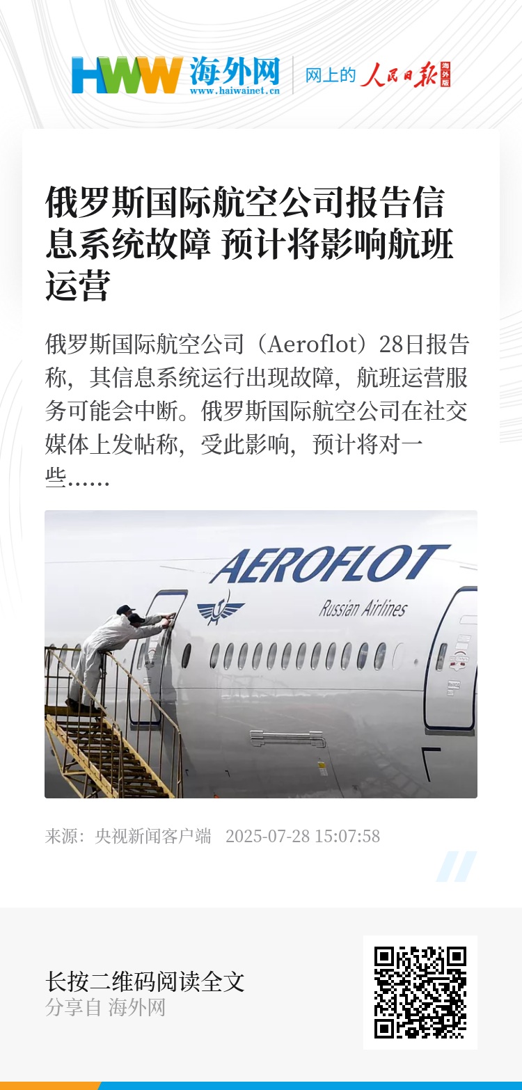 俄罗斯国际航空公司(Aeroflot)28日报告称,其信息系统运行出现故障,航班运营服务可能会中断。