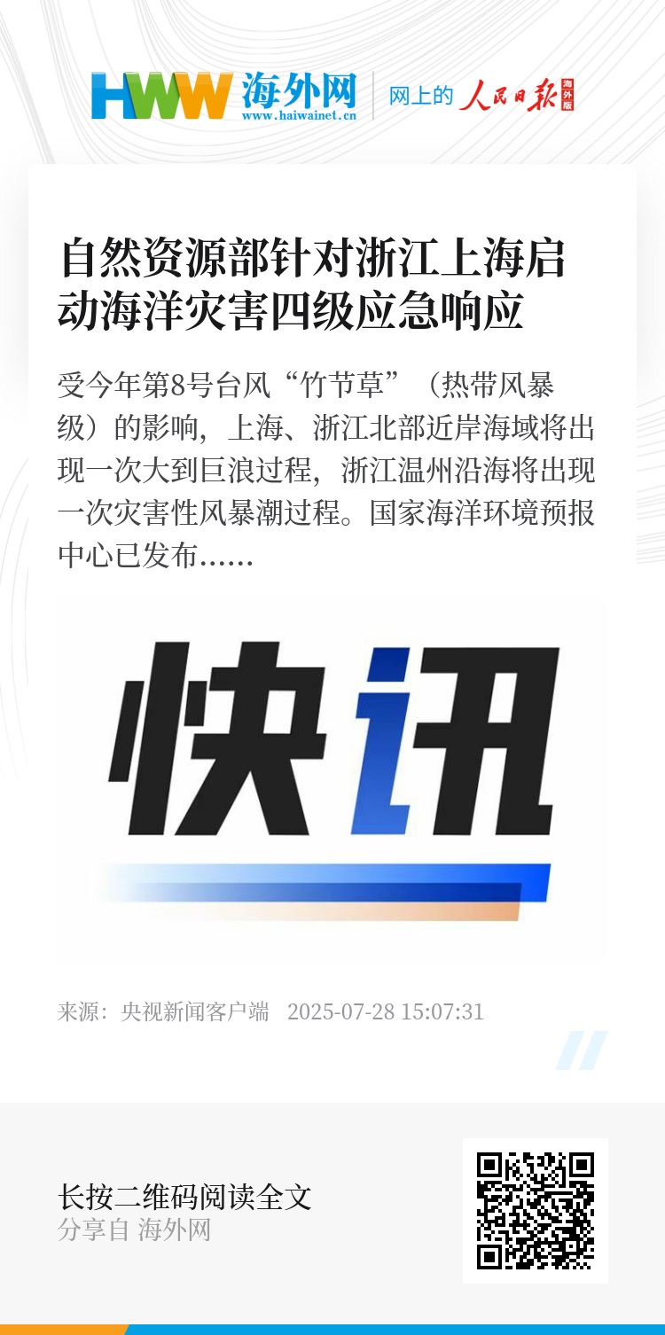 根据《海洋灾害应急预案》规定,自然资源部已于7月28日9时针对浙江省和上海市启动海洋灾害四级应急响应,要求两省(市)自然资源(海洋)主管部门按照职责做好防潮御浪的应急准备工作;各涉海相关生产单位采取积极有效的措施,组织渔船、养殖渔排、养殖场等做好防潮准备。