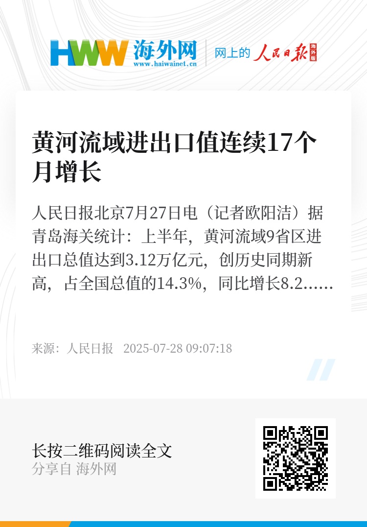人民日报北京7月27日电(记者欧阳洁)据青岛海关统计:上半年,黄河流域9省区进出口总值达到3.12万亿元,创历史同期新高,占全国总值的14.3%,同比增长8.2%,连续17个月保持增长,高于全国整体增速5.3个百分点。黄河流域正在成为外贸发展的重要引擎之一。