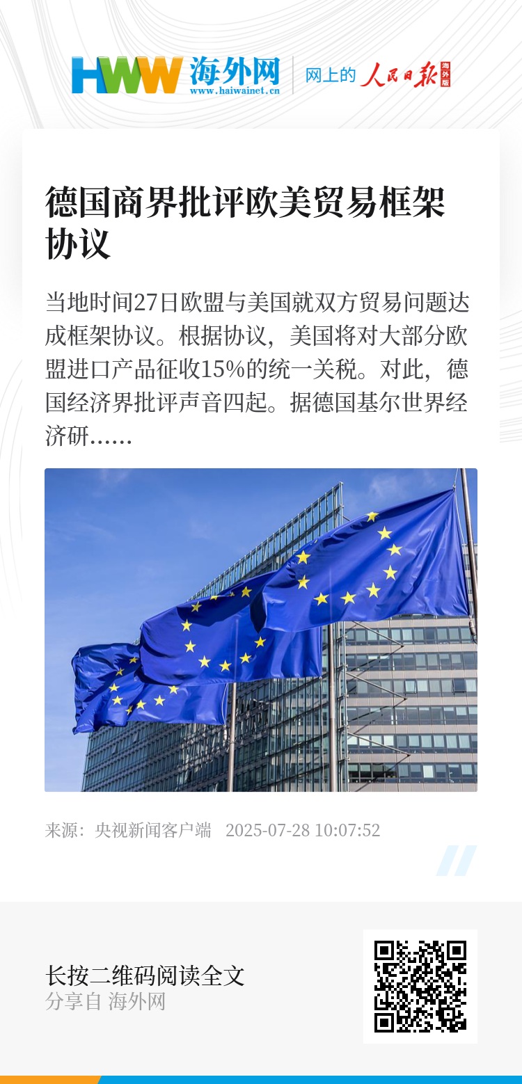 当地时间27日欧盟与美国就双方贸易问题达成框架协议。根据协议,美国将对大部分欧盟进口产品征收15%的统一关税。对此,德国经济界批评声音四起。