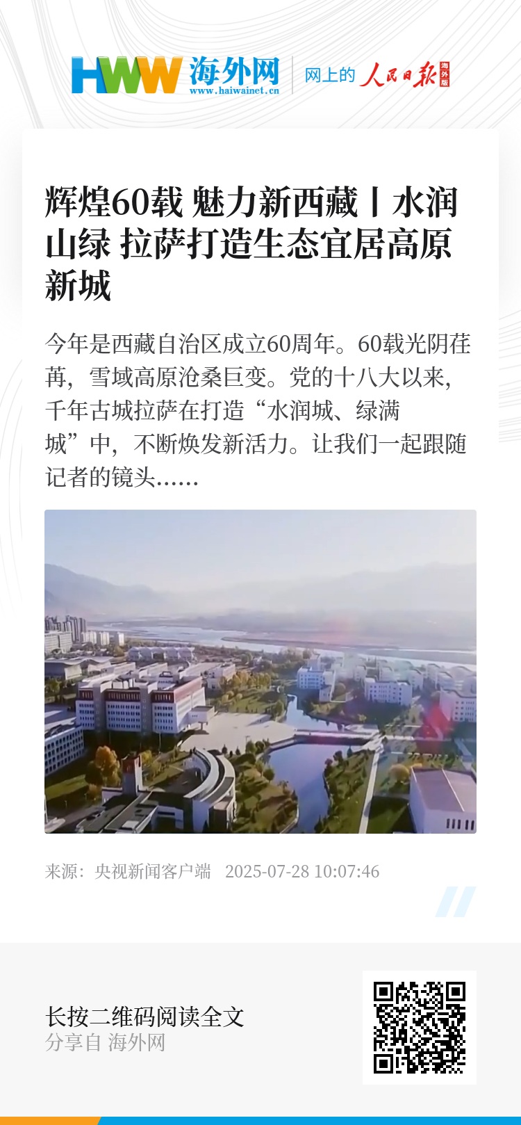 今年是西藏自治区成立60周年。60载光阴荏苒,雪域高原沧桑巨变。党的十八大以来,千年古城拉萨在打造“水润城、绿满城”中,不断焕发新活力。让我们一起跟随记者的镜头,去感受这座高原之城的生态宜居新变化。