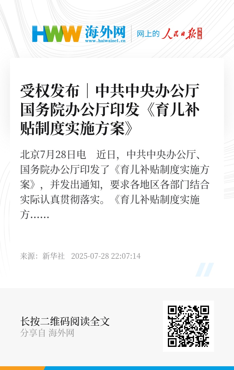 新华社北京7月28日电 近日,中共中央办公厅、国务院办公厅印发了《育儿补贴制度实施方案》,并发出通知,要求各地区各部门结合实际认真贯彻落实。