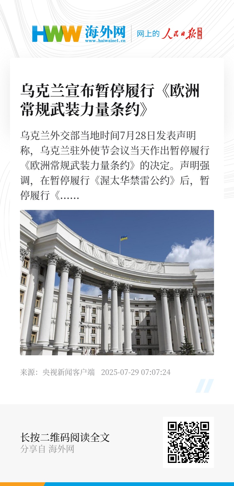 乌克兰外交部当地时间7月28日发表声明称,乌克兰驻外使节会议当天作出暂停履行《欧洲常规武装力量条约》的决定。声明强调,在暂停履行《渥太华禁雷公约》后,暂停履行《欧洲常规武装力量条约》是乌克兰强化国防的下一步举措。