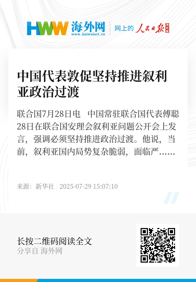 他说,当前,叙利亚国内局势复杂脆弱,面临严峻挑战。叙有关各方应该从国家和人民的根本利益出发,相向而行,共同为叙利亚实现安全与稳定、恢复经济社会发展作出努力。叙临时当局应当积极推进包容性政治过渡,通过广泛对话解决各方关切。叙南部苏韦达地区冲突各方必须恪守已达成的停火协议,避免发生新的冲突。