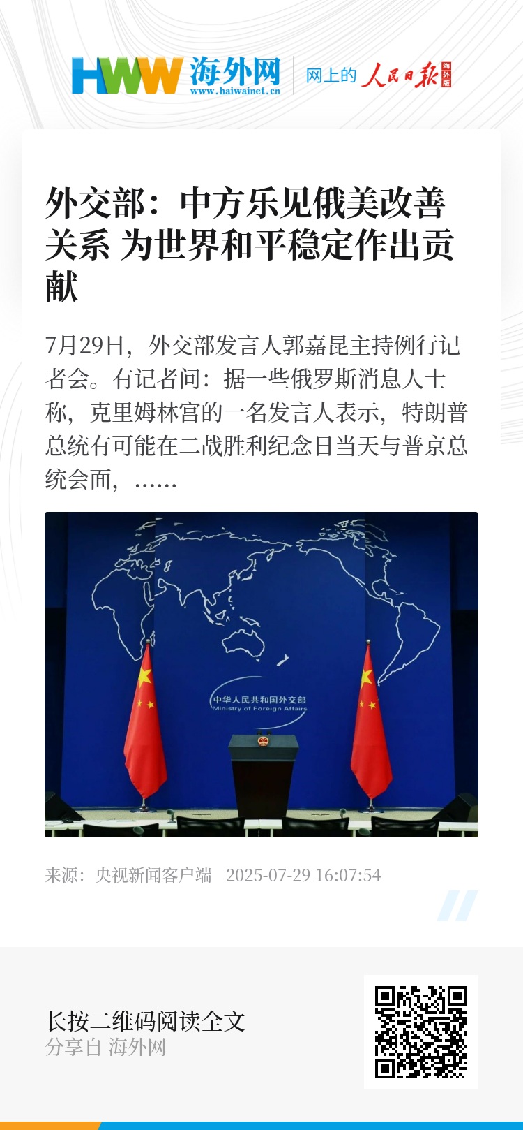 7月29日,外交部发言人郭嘉昆主持例行记者会。有记者问:据一些俄罗斯消息人士称,克里姆林宫的一名发言人表示,特朗普总统有可能在二战胜利纪念日当天与普京总统会面,当天有阅兵仪式,这有可能成为两人之间的会晤场合。中方有何评论?
