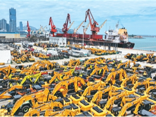 日前,在江苏省连云港港东方港务分公司码头,一艘货轮正在装载出口国外的工程机械装备。据了解,这批工程机械装备中有不少是美资企业在华设厂生产的。王 春摄(人民图片)