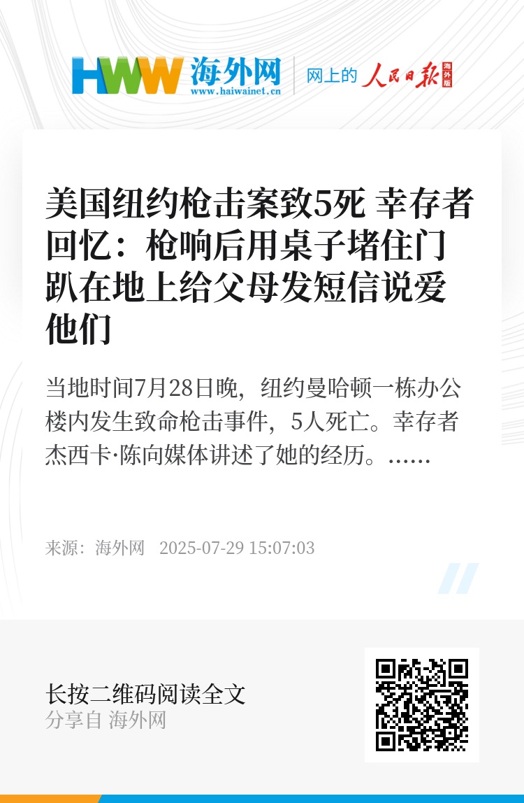 海外网7月29日电 据美国广播公司(ABC)报道,当地时间7月28日晚,纽约曼哈顿一栋办公楼内发生致命枪击事件,5人死亡。幸存者杰西卡·陈向媒体讲述了她的经历。