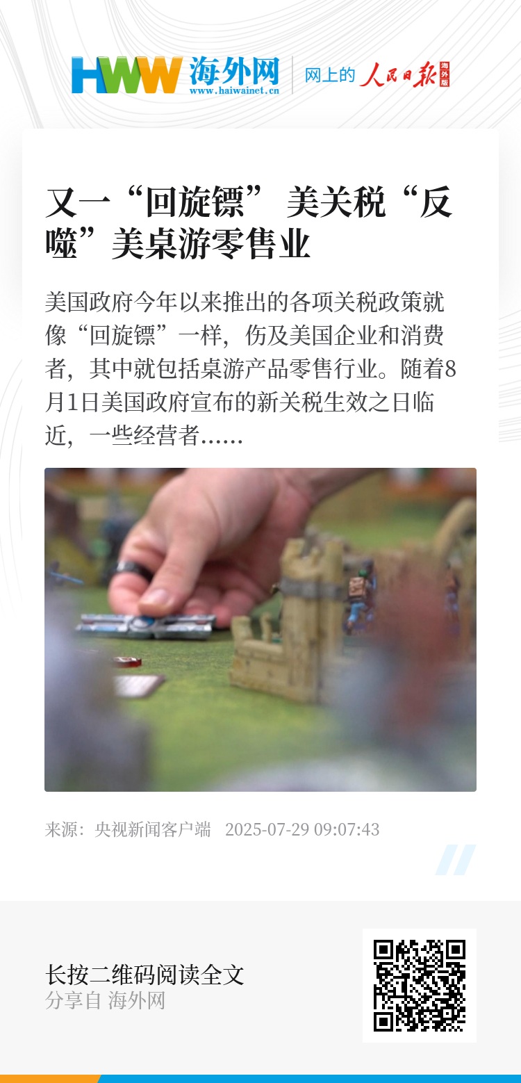 美国政府今年以来推出的各项关税政策就像“回旋镖”一样,伤及美国企业和消费者,其中就包括桌游产品零售行业。随着8月1日美国政府宣布的新关税生效之日临近,一些经营者的担忧情绪愈发严重。