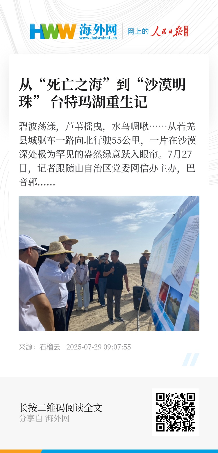 台特玛湖从“死亡之海”到“碧波重现”的蜕变,是中国生态文明建设在西北干旱区的生动缩影。其“重生”故事为全球干旱半干旱地区的生态治理提供了宝贵的“中国方案”和“新疆经验”,深刻启示人们:守护绿洲,就是守护人类共同的家园;实现人与自然和谐共生,是可持续发展的必由之路,也是建设美丽中国的坚实根基。(石榴云/新疆日报记者 赵梅)