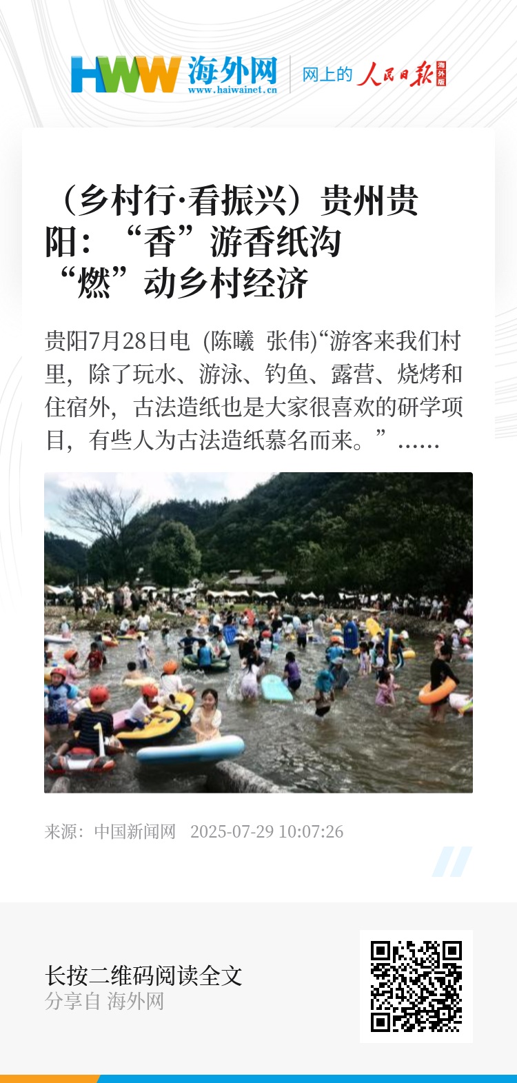 中新网贵阳7月28日电 (陈曦 张伟)“游客来我们村里,除了玩水、游泳、钓鱼、露营、烧烤和住宿外,古法造纸也是大家很喜欢的研学项目,有些人为古法造纸慕名而来。”贵州省贵阳市乌当区新堡布依族乡开农家乐的汪锡平告诉记者。