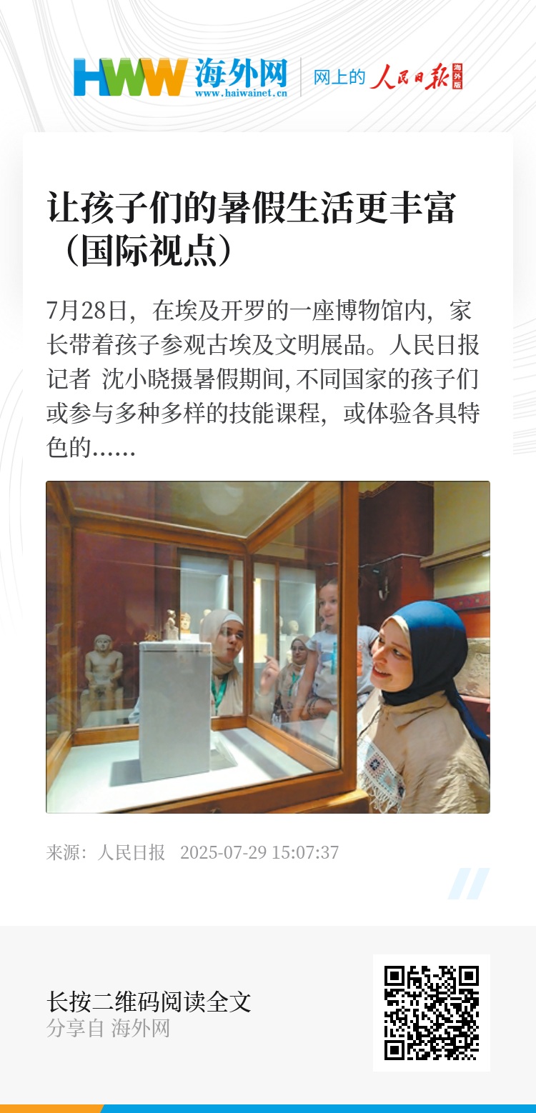 暑假期间,不同国家的孩子们或参与多种多样的技能课程,或体验各具特色的文旅活动。政府机构、社会团体、学校和家长努力创造便利条件,组织各类活动,鼓励孩子们自由探索、发掘兴趣、增长知识、提升自我,过一个快乐且有意义的暑假。