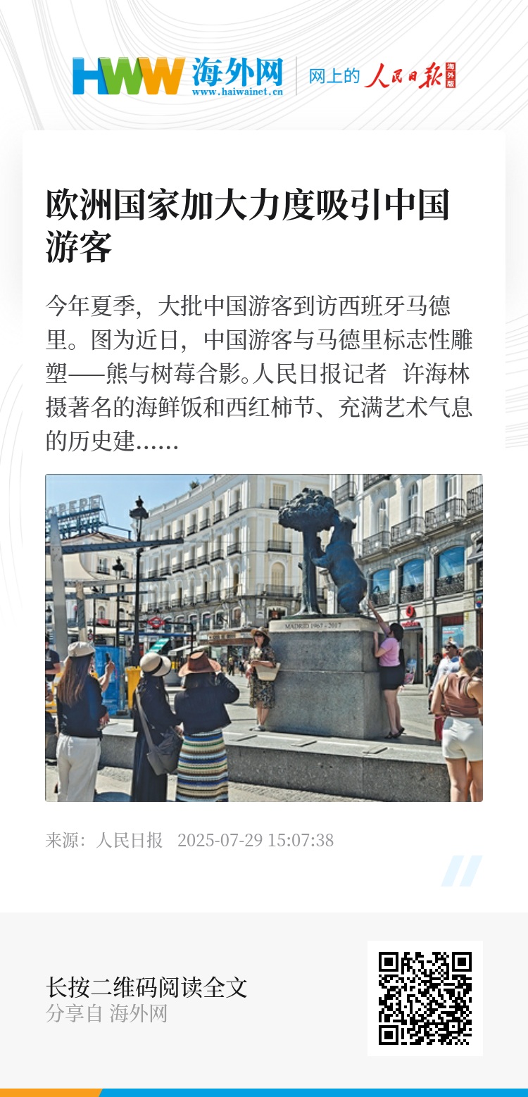 今年夏季,大批中国游客到访西班牙马德里。图为近日,中国游客与马德里标志性雕塑——熊与树莓合影。