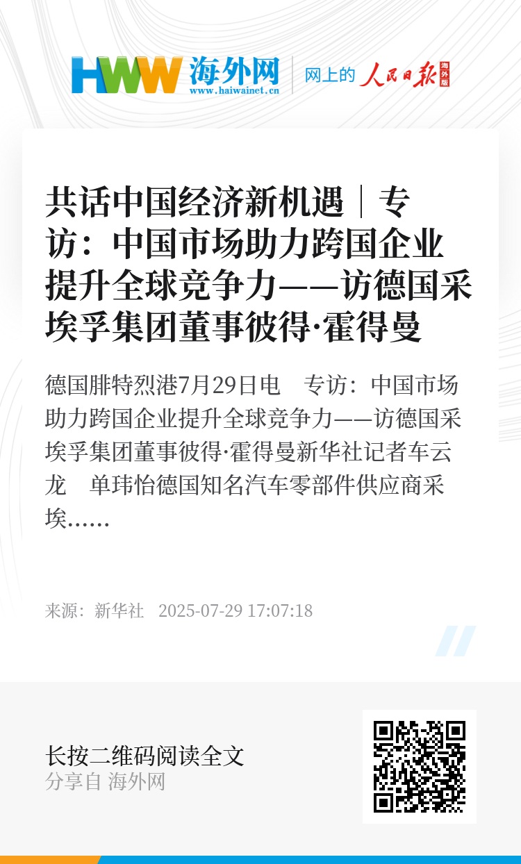 新华社德国腓特烈港7月29日电 专访:中国市场助力跨国企业提升全球竞争力——访德国采埃孚集团董事彼得·霍得曼