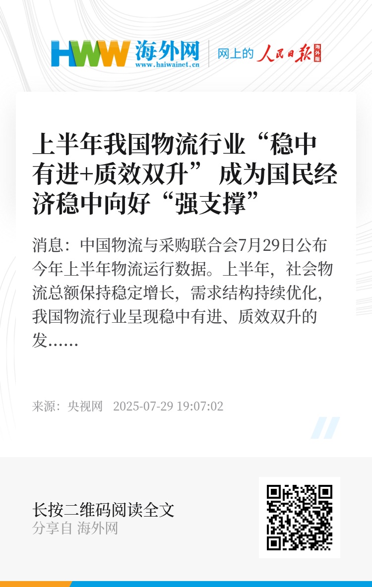 央视网消息:中国物流与采购联合会7月29日公布今年上半年物流运行数据。上半年,社会物流总额保持稳定增长,需求结构持续优化,我国物流行业呈现稳中有进、质效双升的发展态势。