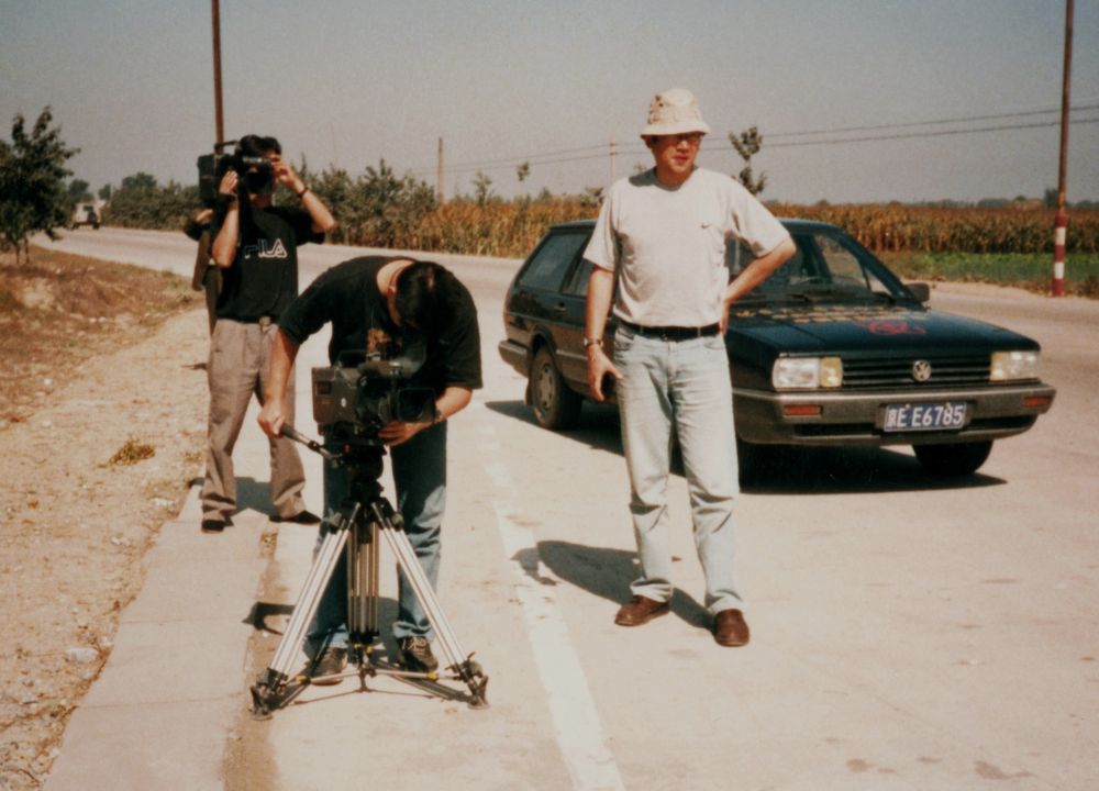 冯雪松(右)和摄制组在保定当年的战地寻访。孙进柱 摄