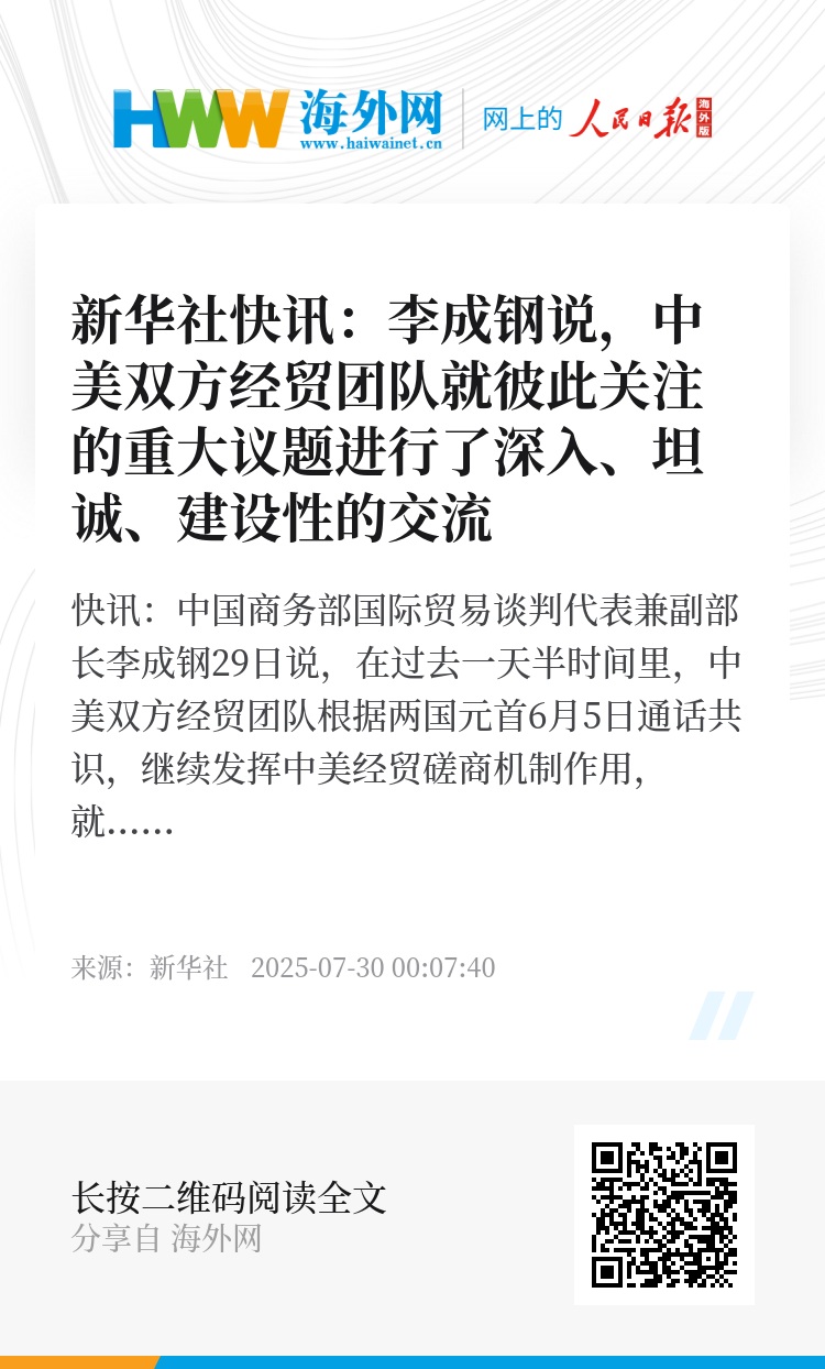 新华社快讯:中国商务部国际贸易谈判代表兼副部长李成钢29日说,在过去一天半时间里,中美双方经贸团队根据两国元首6月5日通话共识,继续发挥中美经贸磋商机制作用,就彼此关注的重大议题进行了深入、坦诚、建设性的交流。