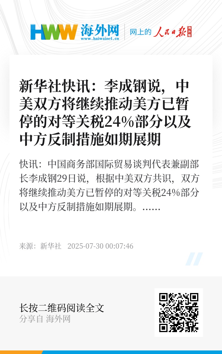 新华社快讯:中国商务部国际贸易谈判代表兼副部长李成钢29日说,根据中美双方共识,双方将继续推动美方已暂停的对等关税24%部分以及中方反制措施如期展期。