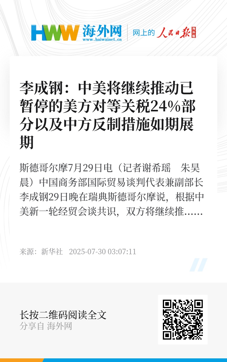 新华社斯德哥尔摩7月29日电(记者谢希瑶 朱昊晨)中国商务部国际贸易谈判代表兼副部长李成钢29日晚在瑞典斯德哥尔摩说,根据中美新一轮经贸会谈共识,双方将继续推动已暂停的美方对等关税24%部分以及中方反制措施如期展期。