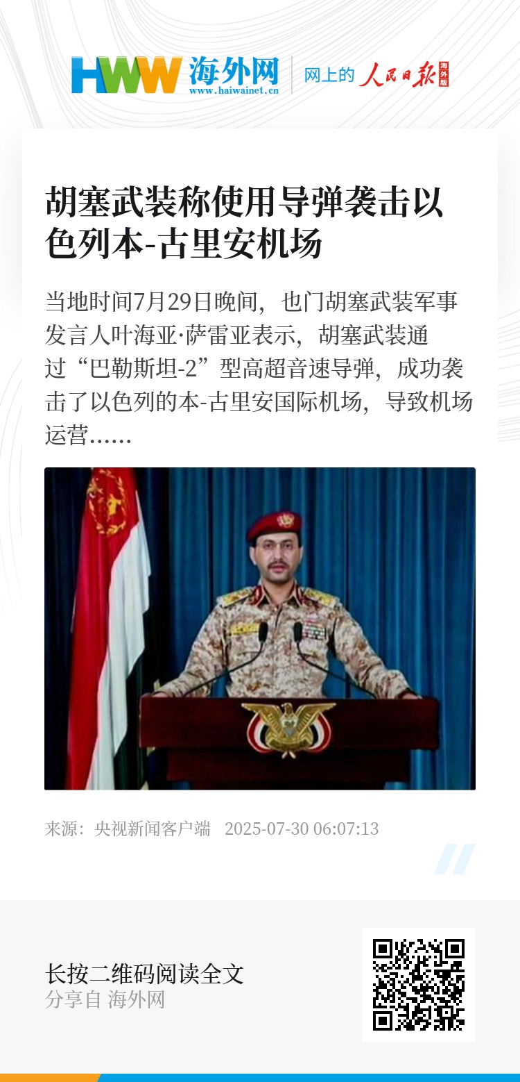 当地时间7月29日晚间,也门胡塞武装军事发言人叶海亚·萨雷亚表示,胡塞武装通过“巴勒斯坦-2”型高超音速导弹,成功袭击了以色列的本-古里安国际机场,导致机场运营中断。