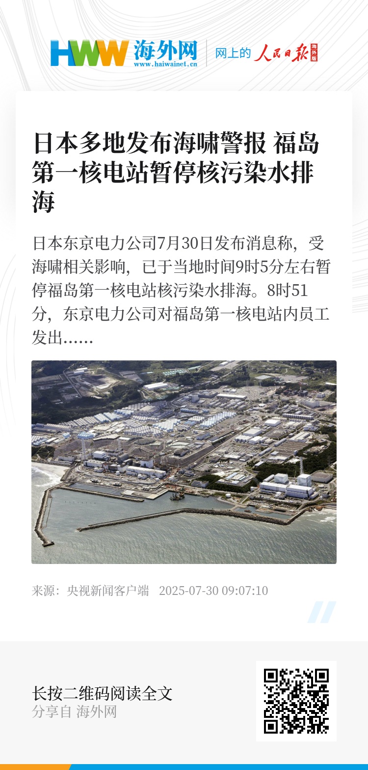 日本东京电力公司7月30日发布消息称,受海啸相关影响,已于当地时间9时5分左右暂停福岛第一核电站核污染水排海。8时51分,东京电力公司对福岛第一核电站内员工发出避难指示,并称将关注海啸信息,监测海啸是否会对核电站产生影响。