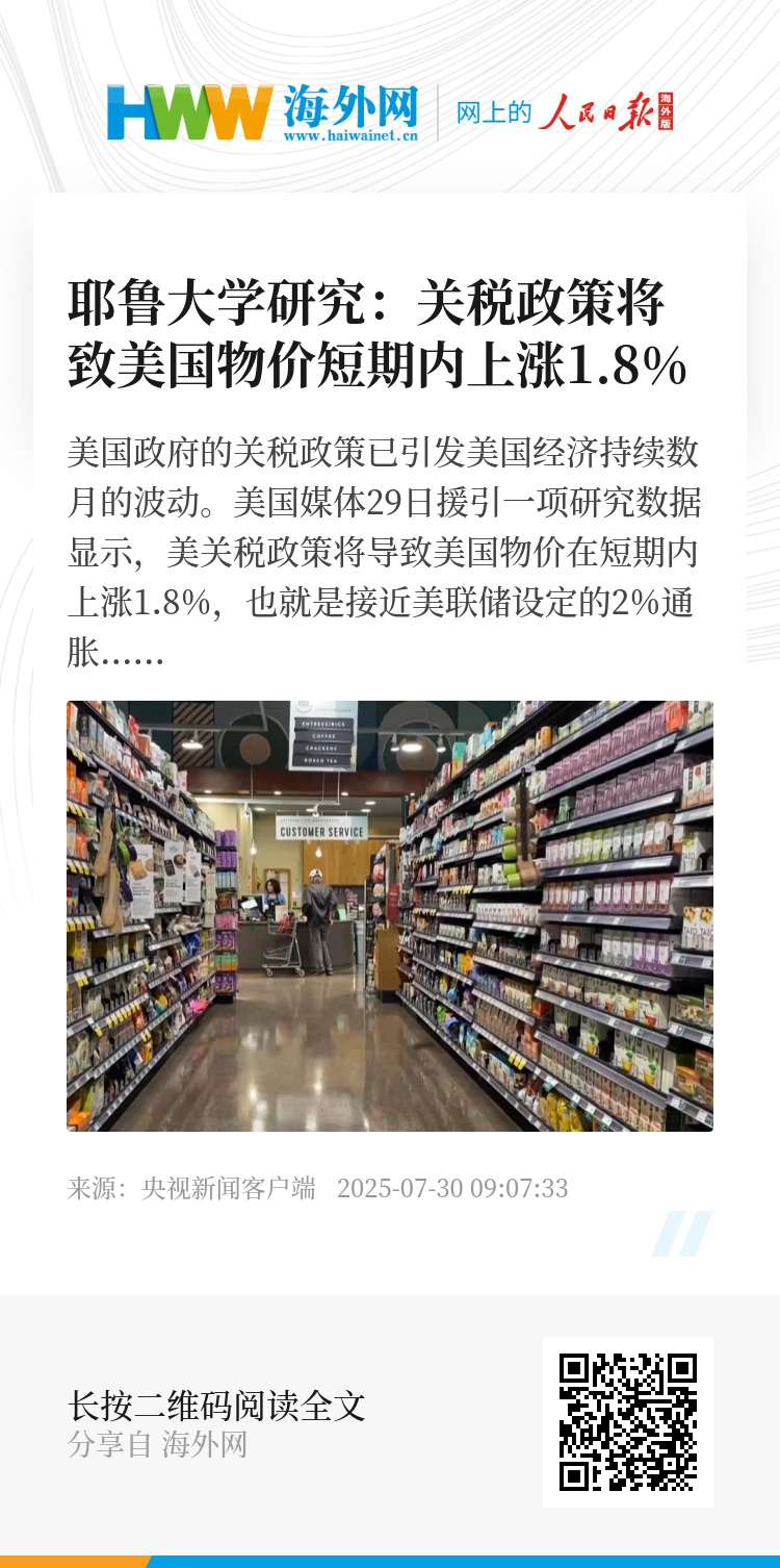 美国政府的关税政策已引发美国经济持续数月的波动。美国媒体29日援引一项研究数据显示,美关税政策将导致美国物价在短期内上涨1.8%,也就是接近美联储设定的2%通胀控制目标。