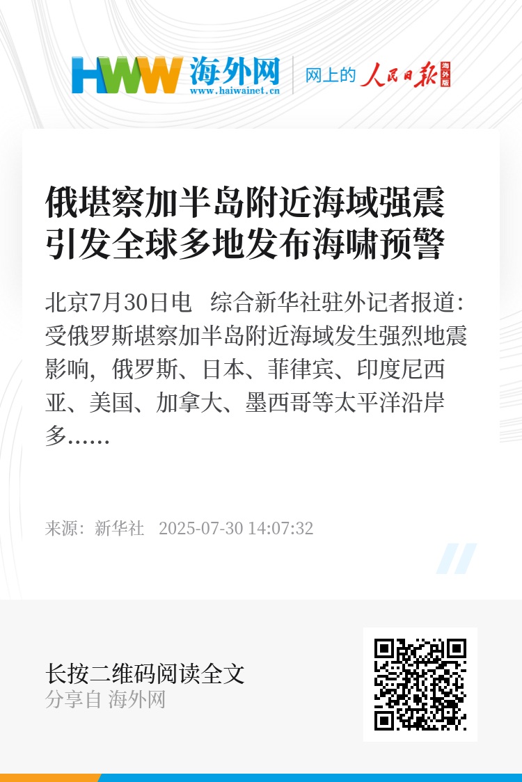 新华社北京7月30日电 综合新华社驻外记者报道:受俄罗斯堪察加半岛附近海域发生强烈地震影响,俄罗斯、日本、菲律宾、印度尼西亚、美国、加拿大、墨西哥等太平洋沿岸多地发布海啸预警或警报。