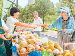 上海市静安区,来自崇明果蔬农场的新鲜水果、蔬菜展销活动在大宁公园举行,吸引众多市民前来购买。李宝洋摄(人民视觉)