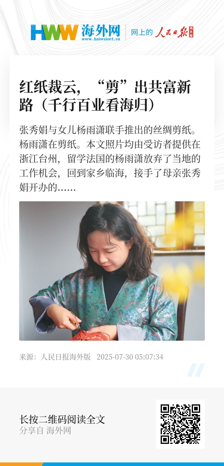 回国近10年,杨雨潇已习惯了挑战与希望并存。在临海,张秀娟为剪纸创新熬红双眼,杨雨潇忙着对接赴海外展览,饰品打样也做得有条不紊。看着手中的剪刀,年轻的传承人意识到,想把老手艺发展好,这把剪子就不能只剪纸、剪绸。也得“剪”成见,再“裁”出新貌。(本报记者 孙亚慧)