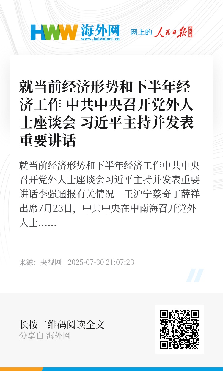 7月23日,中共中央在中南海召开党外人士座谈会,就当前经济形势和下半年经济工作听取各民主党派中央、全国工商联负责人和无党派人士代表的意见建议。中共中央总书记习近平主持座谈会并发表重要讲话强调,做好下半年经济工作,要坚持稳中求进工作总基调,完整准确全面贯彻新发展理念,加快构建新发展格局,保持政策连续性稳定性,增强灵活性预见性,着力稳就业、稳企业、稳市场、稳预期,有力提振消费、破除“内卷”,畅通国内大循环,促进国内国际双循环,努力完成全年经济社会发展目标任务,实现“十四五”圆满收官。