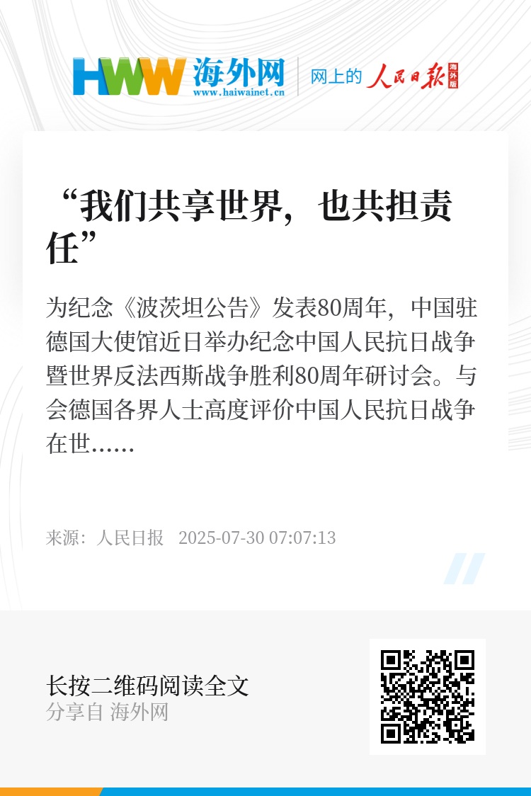 为纪念《波茨坦公告》发表80周年,中国驻德国大使馆近日举办纪念中国人民抗日战争暨世界反法西斯战争胜利80周年研讨会。与会德国各界人士高度评价中国人民抗日战争在世界反法西斯战争中的重要地位,赞赏中方为维护战后国际秩序发挥的关键作用,呼吁德中、欧中增进互信、加强合作,共同维护世界和平稳定。