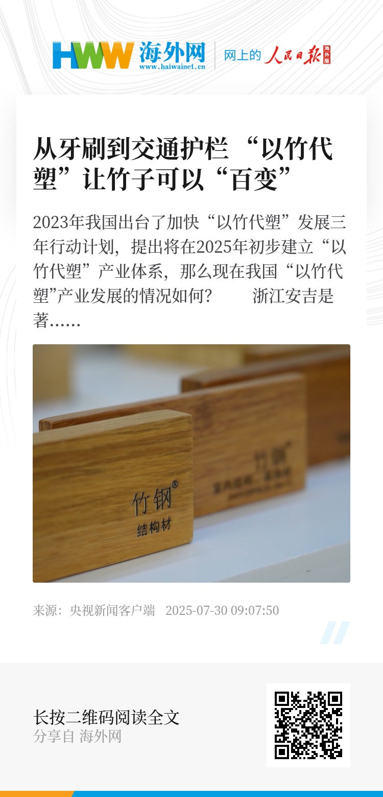 从日用品到工业应用,技术的进步正催生更多“以竹代塑+”产品。在浙江安吉的国家竹产业研究院,记者见到了以竹为主料、树脂为辅料制成的“竹钢”。其纹理似木,“比强度”(单位密度的强度)却是普通碳素结构钢的5倍,适用于高速公路护栏、风车叶片、户外景观等。目前,浙江多条高速公路已广泛应用“竹钢”交通护栏。