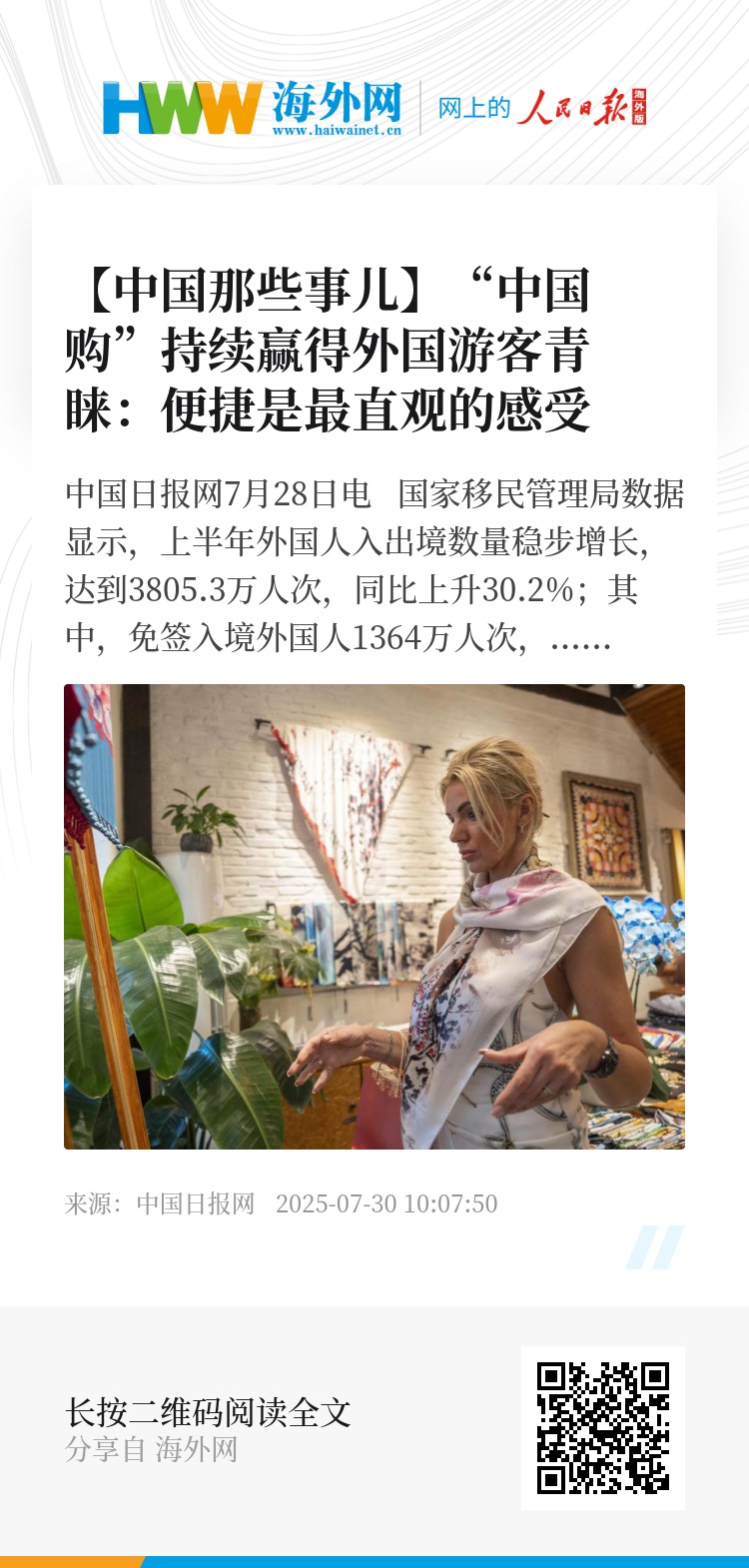 中国日报网7月28日电 国家移民管理局数据显示,上半年外国人入出境数量稳步增长,达到3805.3万人次,同比上升30.2%;其中,免签入境外国人1364万人次,占入境外国人的71.2%,同比上升53.9%。游客在跨越山海一览美丽中国的同时,还能享受物美价优的购物体验,蓬勃发展的入境游为消费市场注入了新活力。