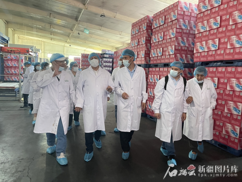 7月24日,代表团在新疆阿米娜特色农业高科技开发有限公司参观饮料加工生产车间。石榴云/新疆日报记者 任华摄