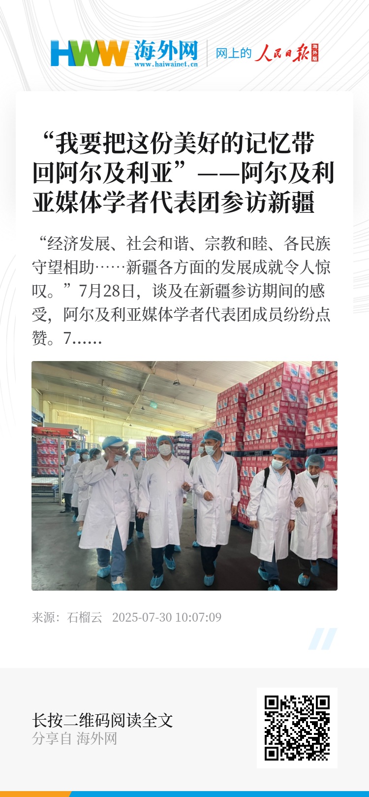 7月22日至28日,阿尔及利亚媒体学者代表团一行8人参访新疆,先后来到乌鲁木齐市、喀什地区、昌吉回族自治州等地,了解新疆社会稳定、经济发展、文化繁荣、民族团结、宗教和睦等方面的情况,深切感受这片土地上的繁荣稳定和人民安居乐业的幸福生活。