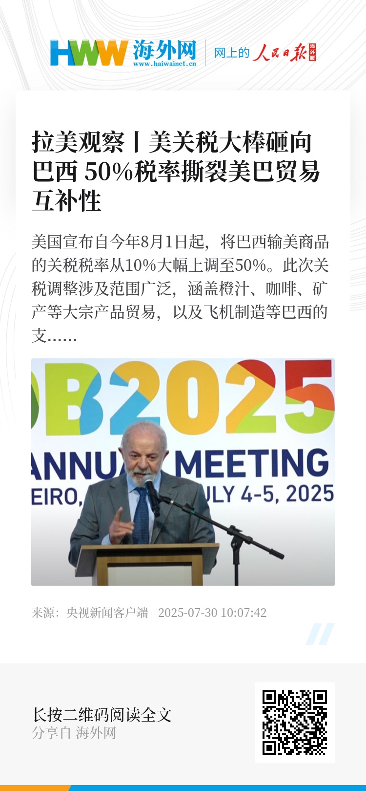 随着关税生效日期临近,巴美之间的紧张关系已不再局限于经贸范畴,而是延伸至国家主权与多边秩序的根本性分歧。在对抗单边主义压力的同时,巴西也在积极寻求多元化的外交与贸易路径。(总台记者 雷湘平)