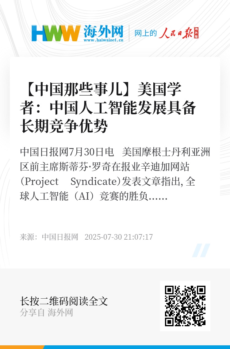 中国日报网7月30日电 美国摩根士丹利亚洲区前主席斯蒂芬·罗奇在报业辛迪加网站(Project Syndicate)发表文章指出,全球人工智能(AI)竞赛的胜负取决于基础研究的投入,而非短期市场表现。罗奇认为,中国凭借产业生态、研发投入和文化传统,使其在长期竞争中占据优势。