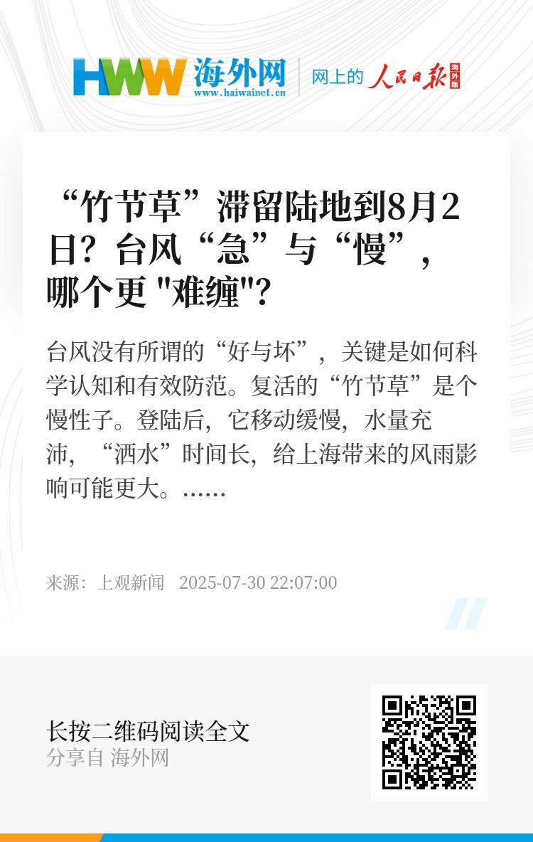 复活的“竹节草”是个慢性子。登陆后,它移动缓慢,水量充沛,“洒水”时间长,给上海带来的风雨影响可能更大。其实,台风个性千奇百怪,有的来去匆匆,有的却磨磨蹭蹭,赖着不走。这些“急性子”与“慢性子”的台风,究竟哪种更让人头疼?气象专家解读,其实两者各有风险,防御需因“风”制宜。