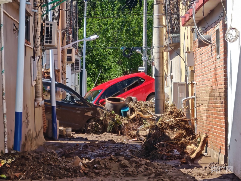 车辆在两排房子中间通道处相撞卡在中间,杂物、树木、淤泥堆叠在一起(央广网记者 庞婷 摄)