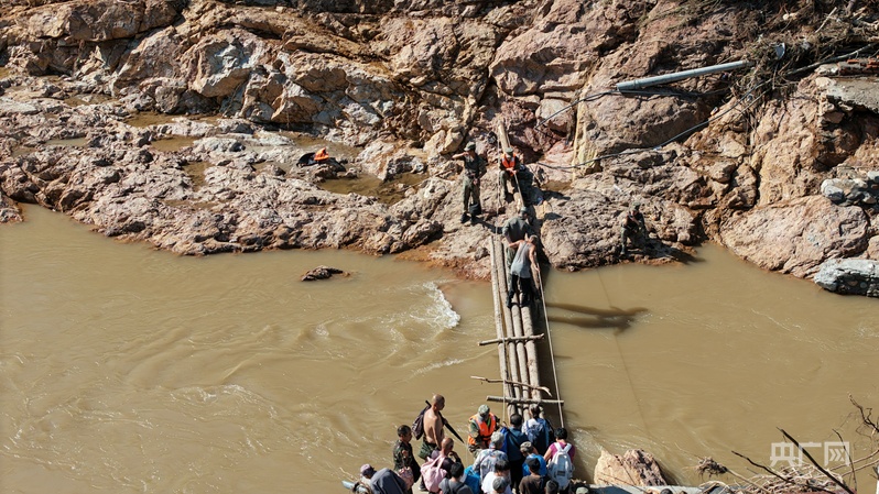 村民从临时搭建的木桥处转移出村(央广网记者 朱冠安 摄)